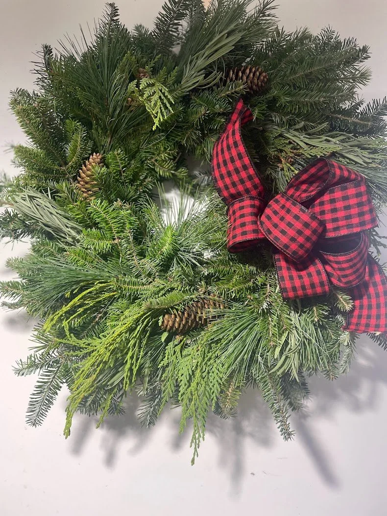 Tis the season! Decorate your home with this cozy Winter Greens Wreath. This wreath is made with a mix of Fraser Fir, Douglas Fir & Pine with added extras such as western red cedar, boxwood, magnolia leaf, pinecones & oranges on the black & white checker ribbon wreath.